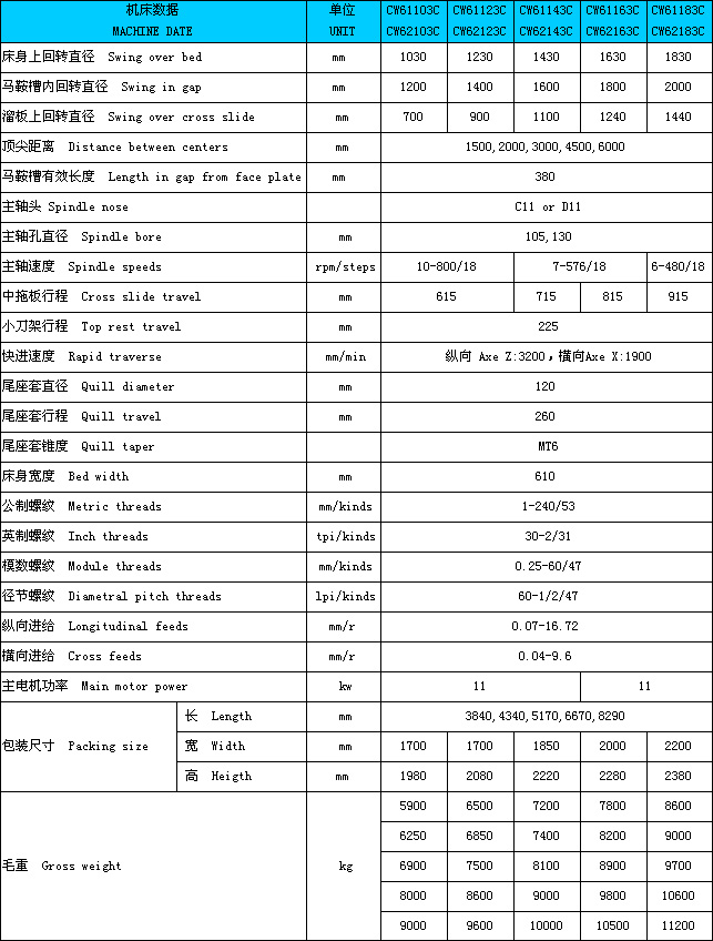 三爪卡盤及法蘭、花盤、中心架(3米以下)、跟刀架、φ130孔徑主軸、電動(dòng)刀架、電動(dòng)尾座。錐度靠模尺。