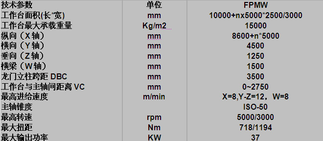 基于FP50系列但采用了龍門框架移動結構(FPM)和升降梁動梁結構(FPMW),工作臺采用座地固定式,可以在加工工件同時調(diào)整安裝另一待加工工件,適用于比FP系列要求更高的超大型復雜工件的加工。